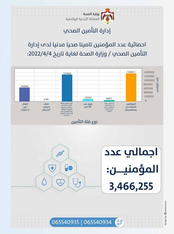 وبحسب احصائية ادارة التأمين الصحي، بلغ عدد الموظفين والمتقاعدين ومنتفعيهم المؤمنين صحيا 134 الفا و617 منتفعا، فيما بلغ عدد المنتفعين فوق 60 عاما 12 الف و 256 و 67 منتفعا، كما بلغ عدد الاسر الفقيرة المنتفعة من شبكة الامان الاجتماعي ومنتفعي صندوق المعونة الوطنية 12 الفا و 746 و25 منتفعا، فيما بلغ عدد مرضى السرطان 2184 منفعا و 650 الف طفل دون عمر 6 سنوات .