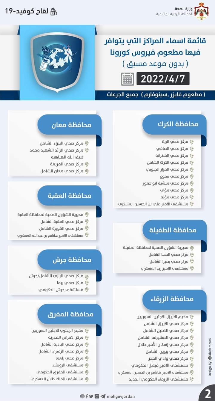 أعلنت وزارة الصحة عن قائمة اسماء المراكز التي يتوافر فيها مطعوم فيروس كورونا (بدون موعد مسبق) #جميع_الجرعات ليوم الخميس الموافق 2022/4/7:
