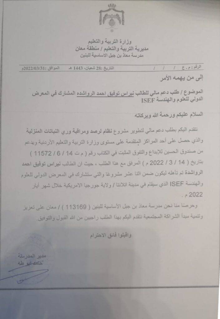 توجه مدير مدرسة معاذ بن جبل الأساسية للبنين في محافظة معان حامد أبو طه، بطلب دعم مالي للطالب نبراس توفيق أحمد الرواشدة المشارك في المعرض الدولي للعلوم والهندسة (ISEF).