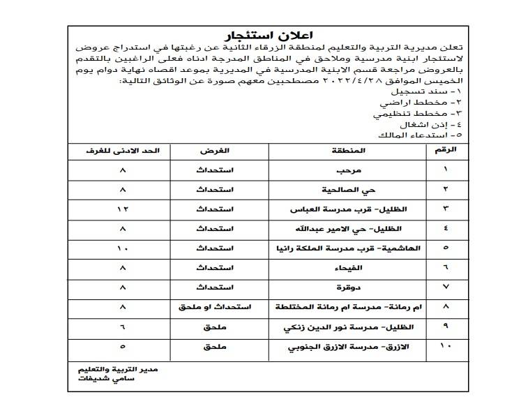 أعلنت مديرية التربية والتعليم لمنطقة الزرقاء الثانية عن رغبتها في استئجار 10 أبنية مدرسية وملاحق صفية.