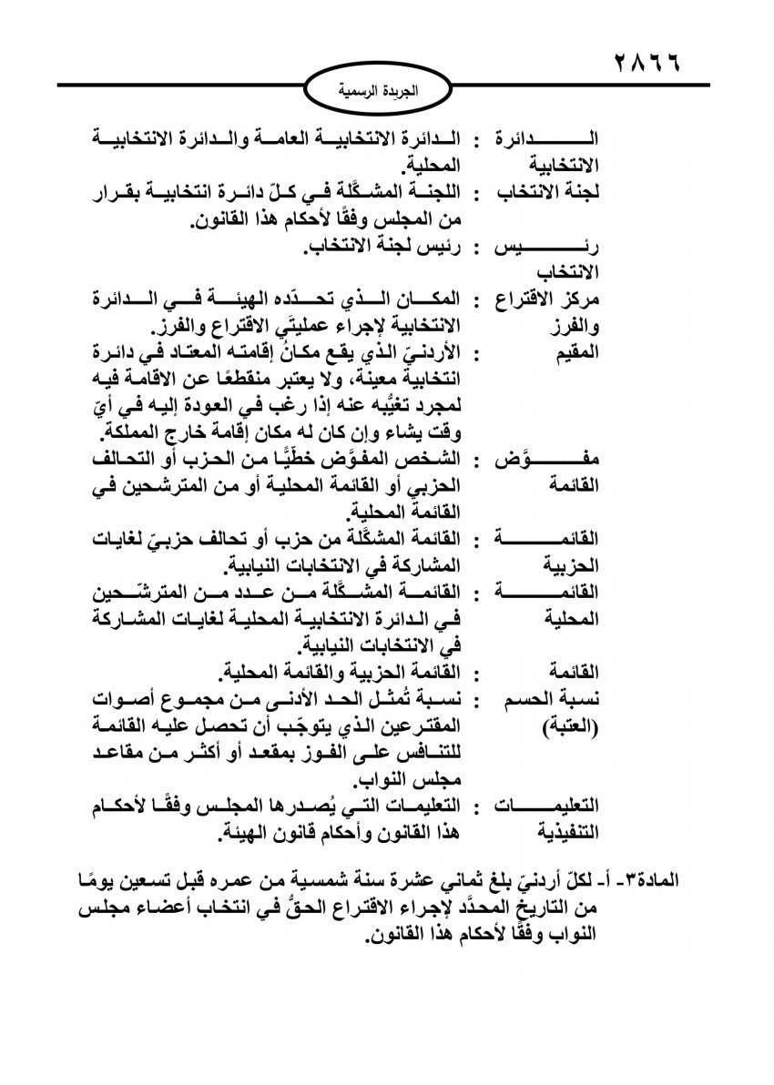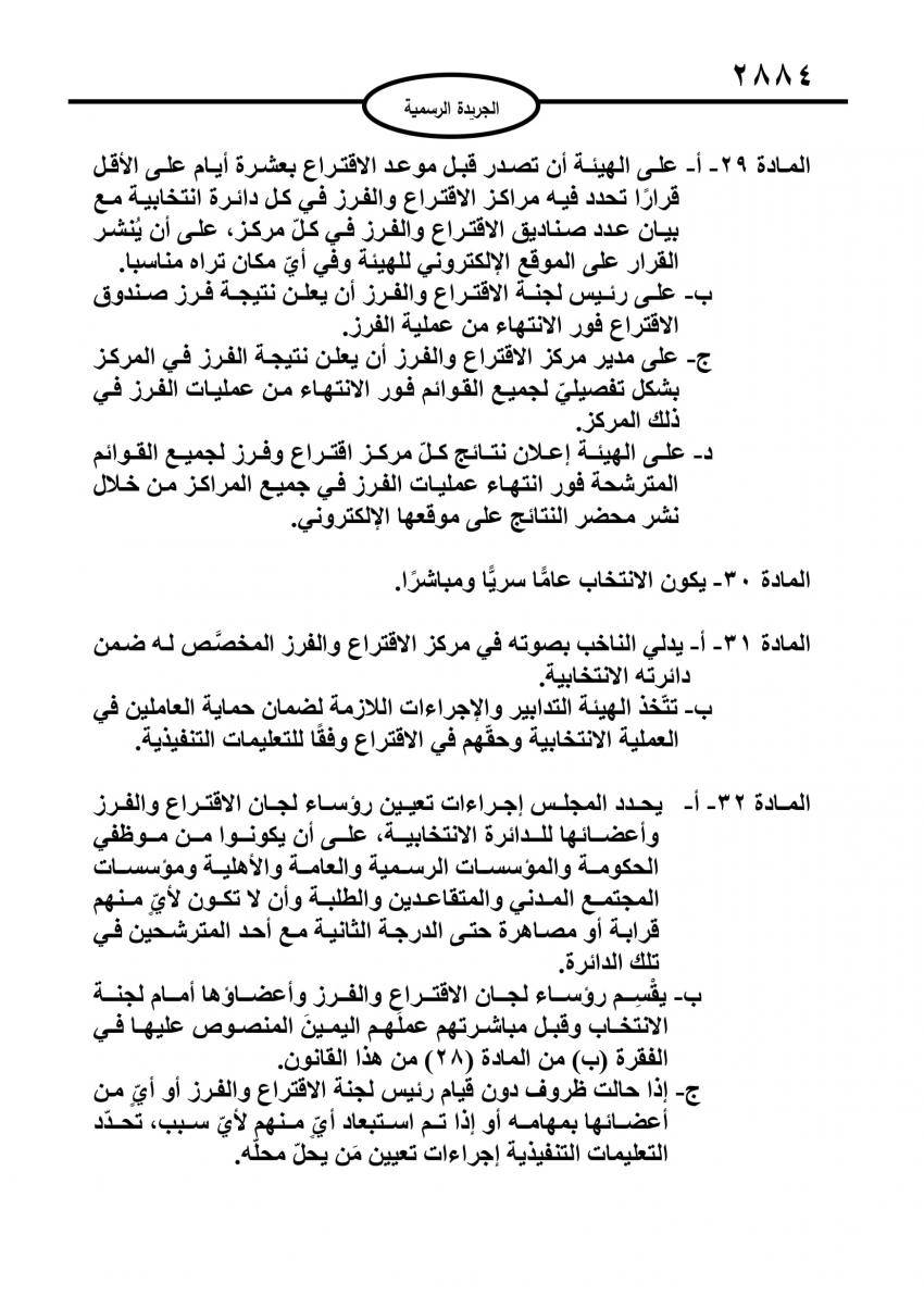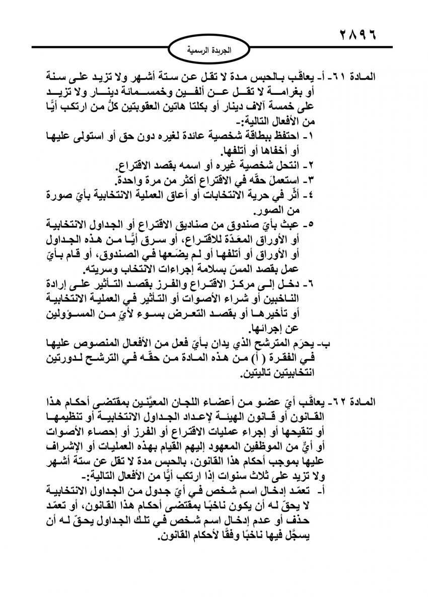 وينشىء القانون دائرة عامة للأحزاب (41 مقعدا)، ويحافظ في نفس الوقت على المكتسبات على مستوى الدوائر المحلية (97 مقعداً) ، كما يمنح صوتين للناخب، مع النص على نسبة حسم (عتبة)، وتخفيض سن الترشح إلى 25 سنة، إضافة إلى فرض عقوبات مشددة على الجرائم الانتخابية.