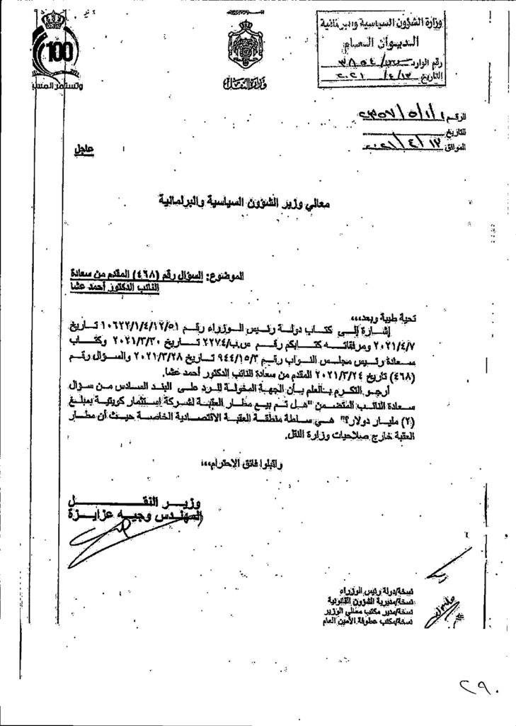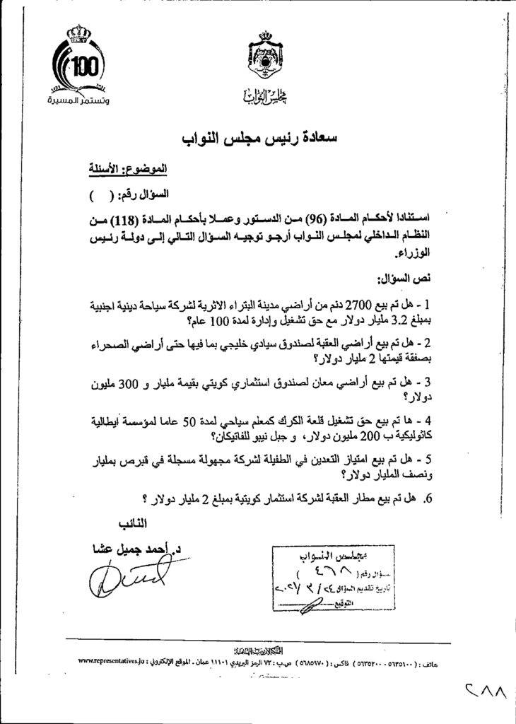 وبحسب الوثائق التي اطلعت عليها "نيروز" والتي تضمنت استفسارات للنائب عشا، حول بيع أراض من مدينة البترا الأثرية ومطار العقبة وأراض في العقبة ومعان، إضافة إلى حق تشغيل قلعة الكرك وجبل نيبو، وامتياز التعدين في الطفيلة.