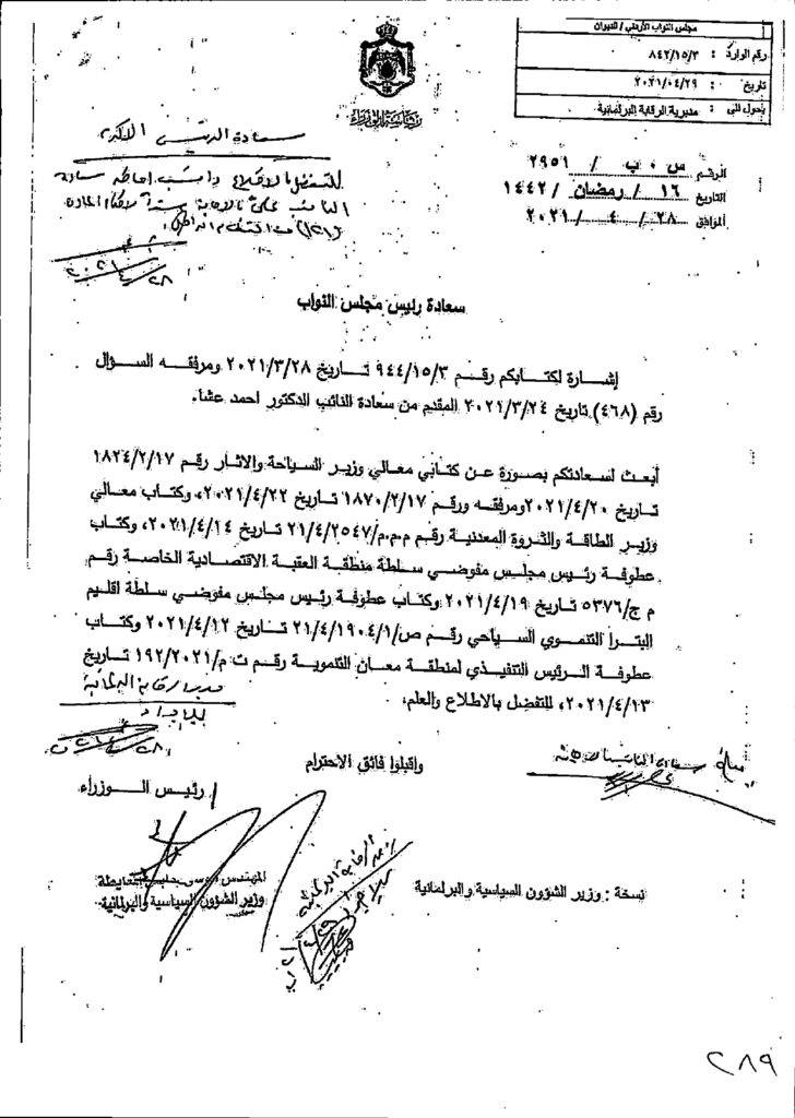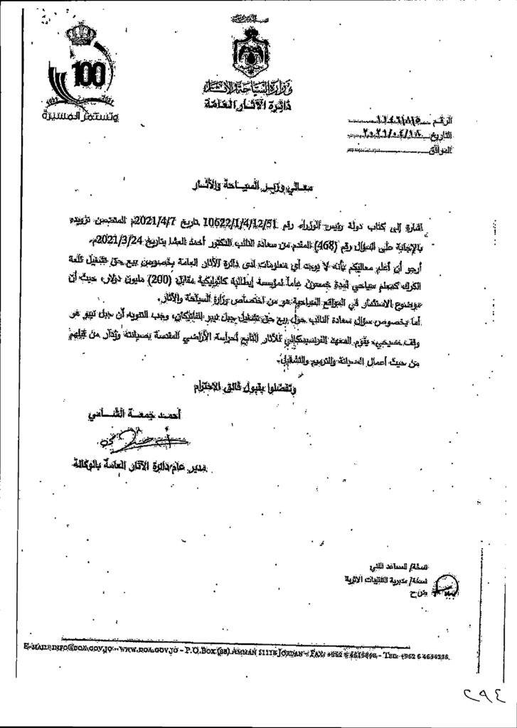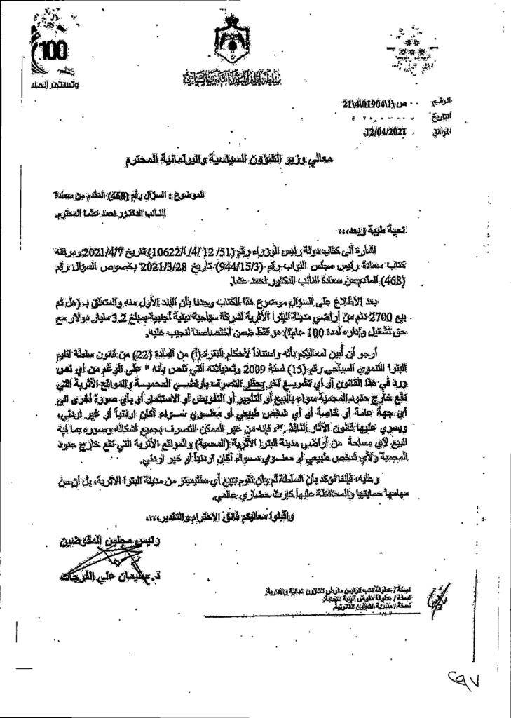 أظهرت إجابات حكومية، على سؤال نيابي للنائب أحمد جميل عشا، أن الحكومة لم تقم ببيع أراض وحقوق تشغيل وإدارة مواقع أثرية في البترا والعقبة وجبل نيبو.