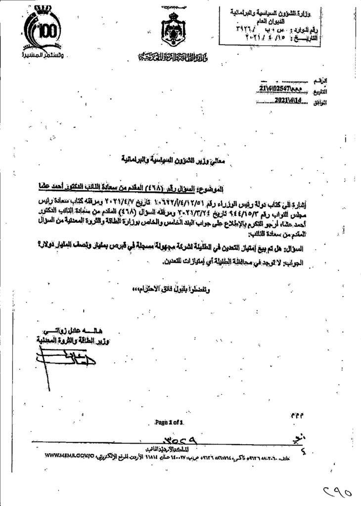 وعن بيع امتياز التعدين في الطفيلة لشركة مجهولة مسجلة في قبرص بمليار ونصف المليار دولار، بينت وزارة الطاقة والثروة المعدنية أنه لا توجد في محافظة الطفيلة أي امتيازات للتعدين.