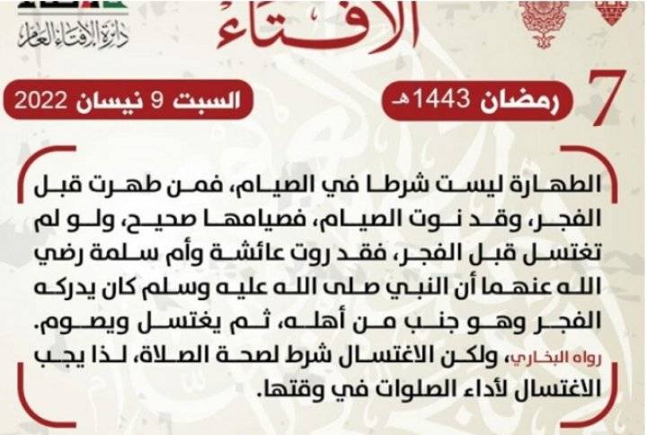 قالت دائرة الإفتاء العام إن الطهارة ليست شرطا في الصيام.