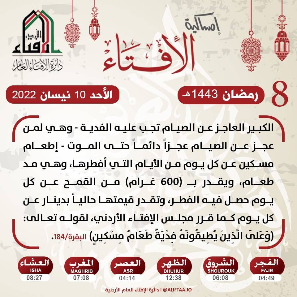 وفي إمساكيتها لليوم الثامن من رمضان، أوضحت الإفتاء أن الفدية لمن عجز عن الصيام عجزًا دائمًا حتى الموت.
