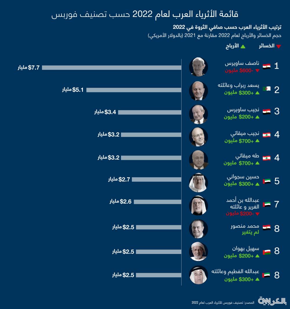 نعرض لكم في الانفوغرافيك أعلاه نظرة على ترتيب الأثرياء العرب في قائمة "فوربس" 2022، حسب صافي الثروة. وحجم الأرباح أو الخسائر لهذا العام.