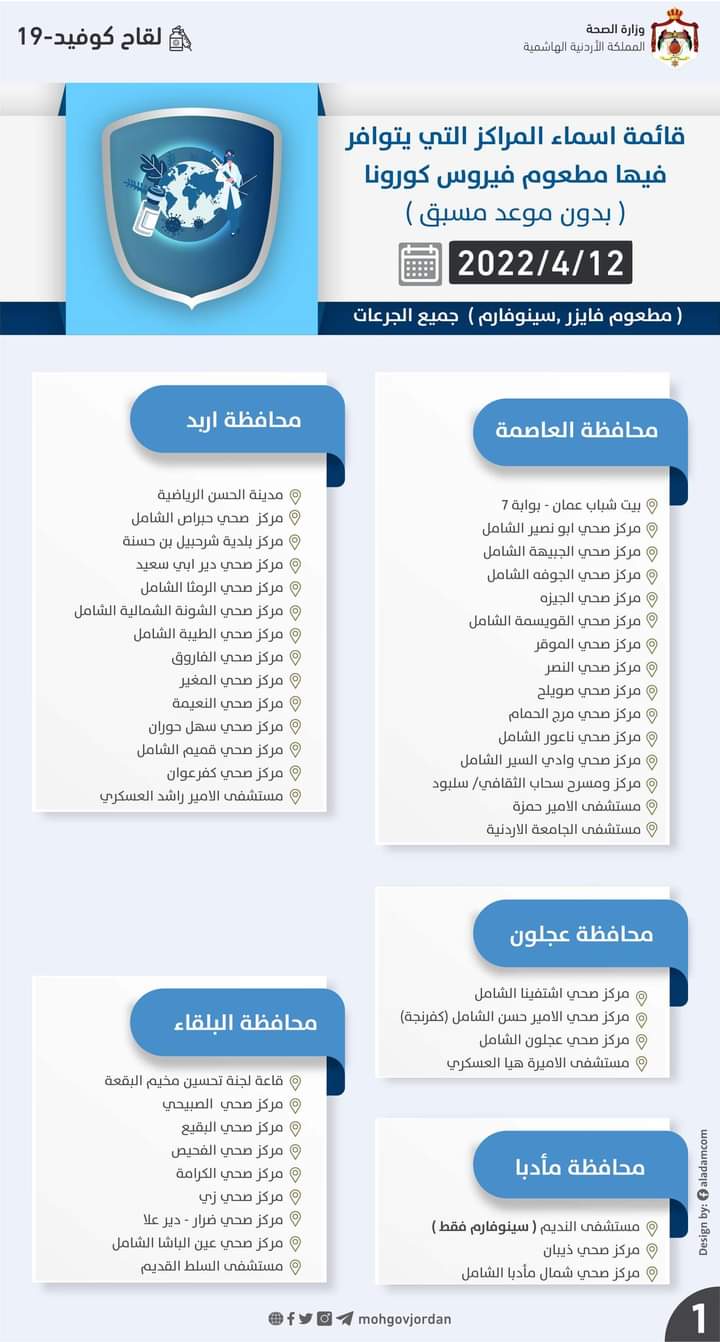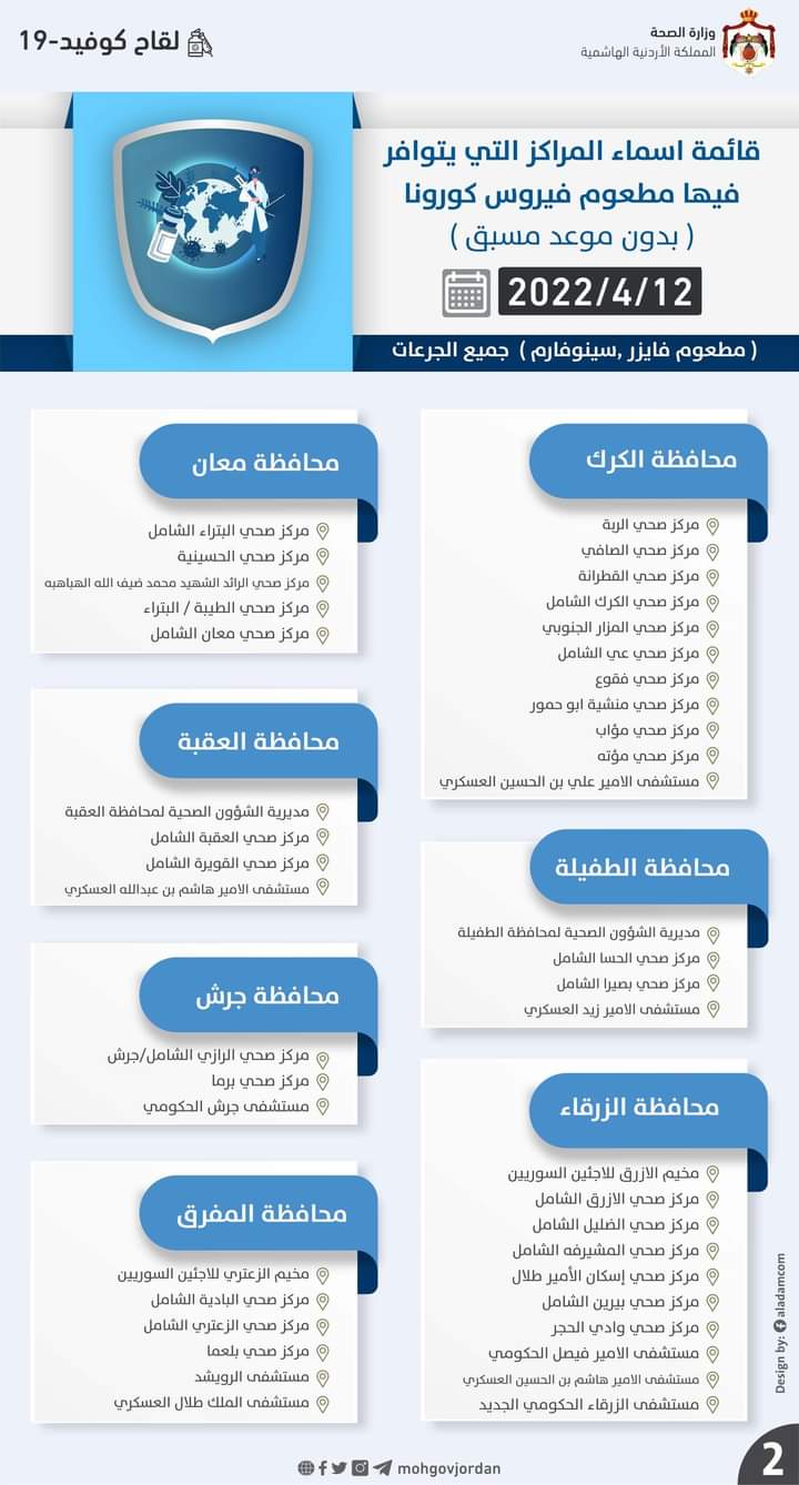 أعلنت وازرة الصحة عن قائمة اسماء المراكز التي يتوافر فيها مطعوم فيروس كورونا (بدون موعد مسبق) وذلك لجميع الجرعات ليوم غد الثلاثاء .