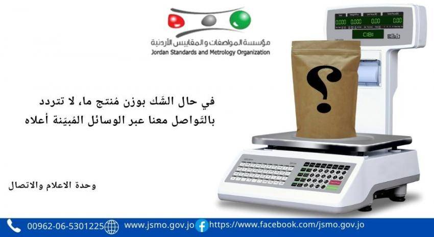وقالت المؤسسة في إدراج لها عبر الفيسبوك الأربعاء، في حال الشك بوزن المنتج أو دقّة الميزان لا تتردد في إبلاغ مؤسسة المواصفات والمقاييس عبر هاتف وواتساب الشكاوى الموحّد (065301243) وصفحات مواقع التواصل الاجتماعي التابعة لنا وموقعنا على الانترنت (www.jsmo.gov.jo) تطبيق "بخدمتكم” وعبر منصّة "سند جو” على الرقم (065008080)".