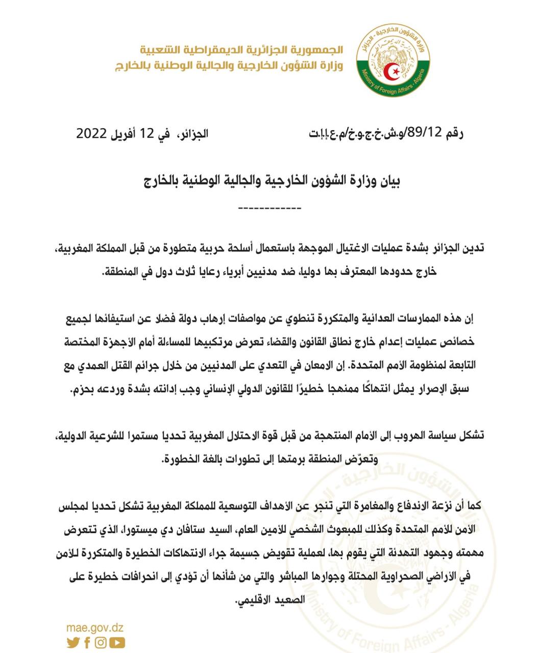 أدانت الجزائر بشدة، يوم امس ، عمليات الاغتيال الموجهة باستعمال أسلحة حربية متطورة من قبل المملكة المغربية، خارج حدودها المعترف بها دوليا، ضد مدنيين أبرياء راح ضحيتها رعايا ثلاث دول.