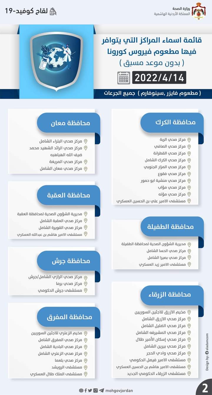 أعلنت وزارة الصحة عن قائمة اسماء المراكز التي يتوافر فيها مطعوم فيروس كورونا (بدون موعد مسبق) #جميع_الجرعات ليوم الخميس الموافق 2022/4/14: