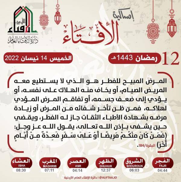 نيروز الإخبارية : أوضحت دائرة الإفتاء العام في امساكية اليوم الثاني عشر من الشهر الفضيل، حكم إفطار المريض في رمضان.