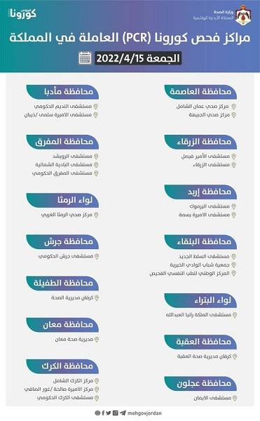 : أعلنت وزارة الصحة عن قائمة بأسماء مراكز فحص كورونا (PCR) العاملة يوم الجمعة 2022/4/15 في المملكة حسب التالي: