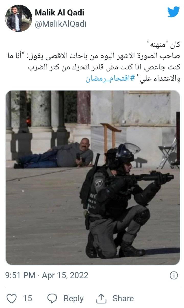 كشف صاحب الصورة الأشهر في أحداث اقتحام المسجد الأقصى من طرف جيش الاحتلال الإسرائيلي تفاصيل اللقطة المتداولة التي تظهره مستلقيا على جانبه ويصور جنديا كان يطلق الرصاص باتجاه الفلسطينيين.