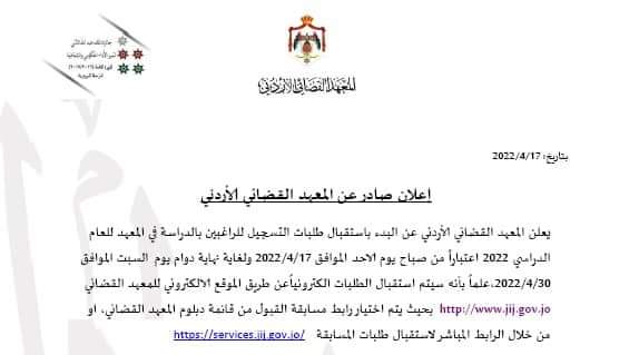 يعلن المعهد القضائي الأردني عن البدء باستقبال طلبات التسجيل للراغبين بالدراسة في المعهد للعام الدراسي 2022 اعتباراً من صباح يوم الاحد الموافق 17/4/2022 ولغاية نهاية دوام يوم السبت الموافق 30/4/2022،علماً بأنه سيتم استقبال الطلبات الكترونياًعن طريق الموقع الالكتروني للمعهد القضائي  http://www.jij.gov.jo بحيث يتم اختيار رابط مسابقة القبول من قائمة دبلوم المعهد القضائي، او من خلال الرابط المباشر لاستقبال طلبات المسابقة https://services.jij.gov.jo/ لكل من تتوافر فيه الشروط التالية:-