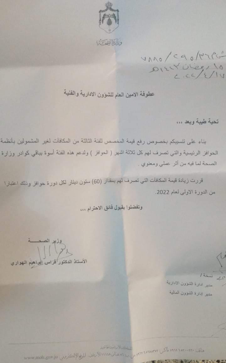 نيروز الإخبارية : قرر وزير الصحة الدكتور فراس الهواري، زيادة قيمة المكافأة التي تصرف للفئة الثالثة كل ثلاثة شهور "حوافز” ولغير المشمولين بأنظمة الحوافز الرئيسية بمقدار 60 دينارا لكل دورة.