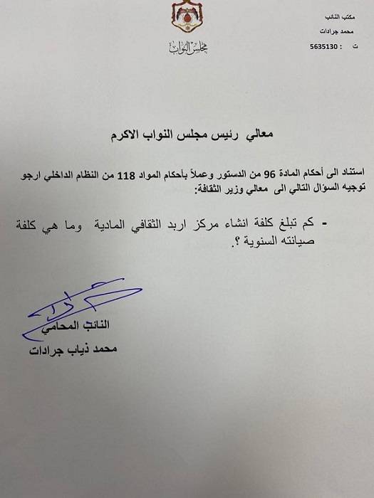 وجه النائب محمد جرادات سؤالا نيابيا لوزير الثقافة حول تكلفة إنشاء مركز إربد الثقافي، وقيمة صيانته السنوية.