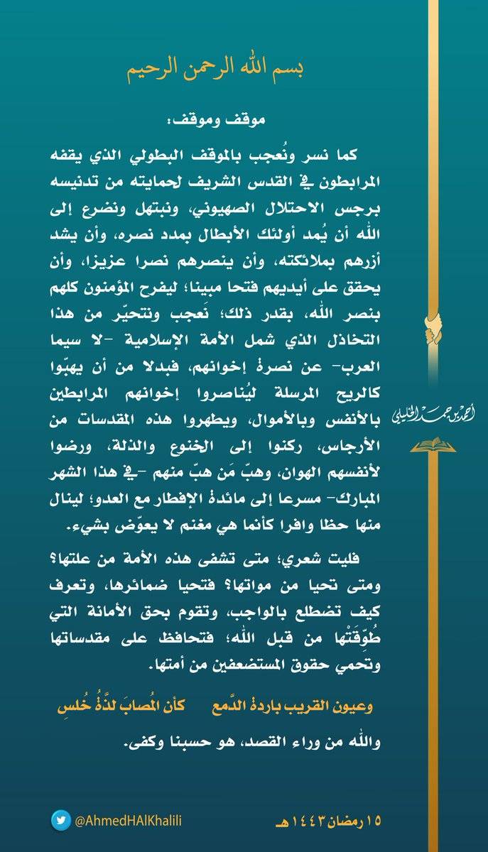 وقال: "كما نُسرّ ونُعجب بالموقف البطولي الذي يقفه المرابطون في القدس الشريف لحمايته من تدنيسه برجس الاحتلال الصهيوني".