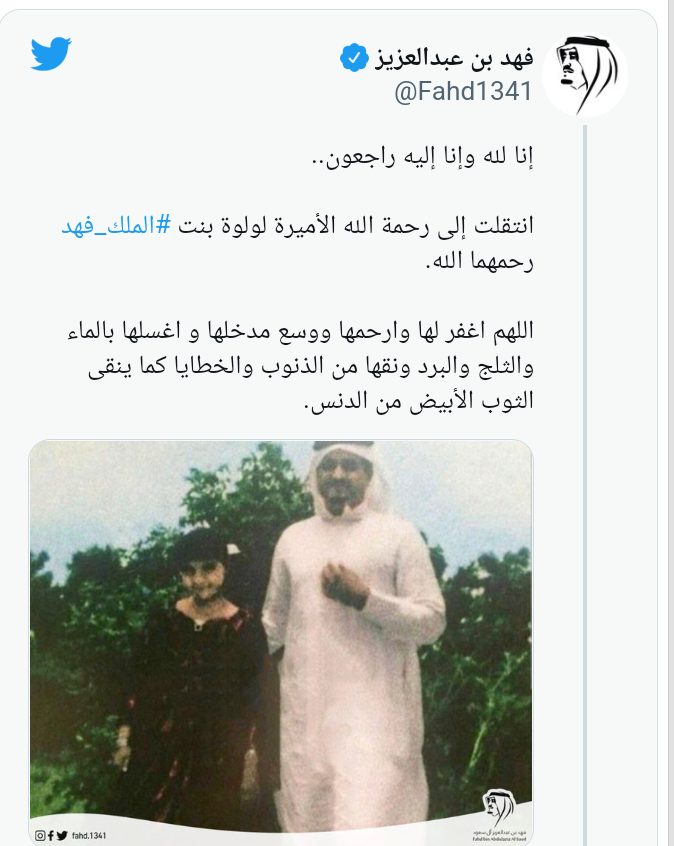 وتداول رواد مواقع التواصل الاجتماعي والصفحات الإخبارية صورة نادرة للأميرة الراحلة لولوة بنت الملك الراحل فهد بن عبد العزيز، وهي في سن صغيرة، تقف بجوار والدها.