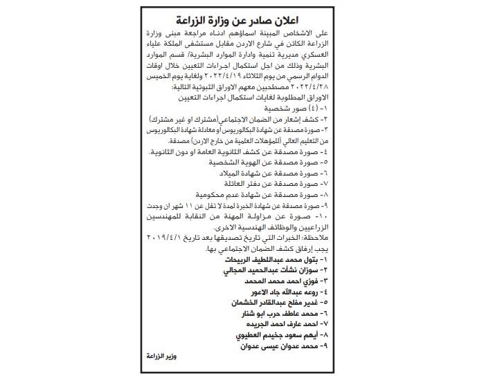 مدعوون لاستكمال إجراءات التعيين في وزارة الزراعة -أسماء