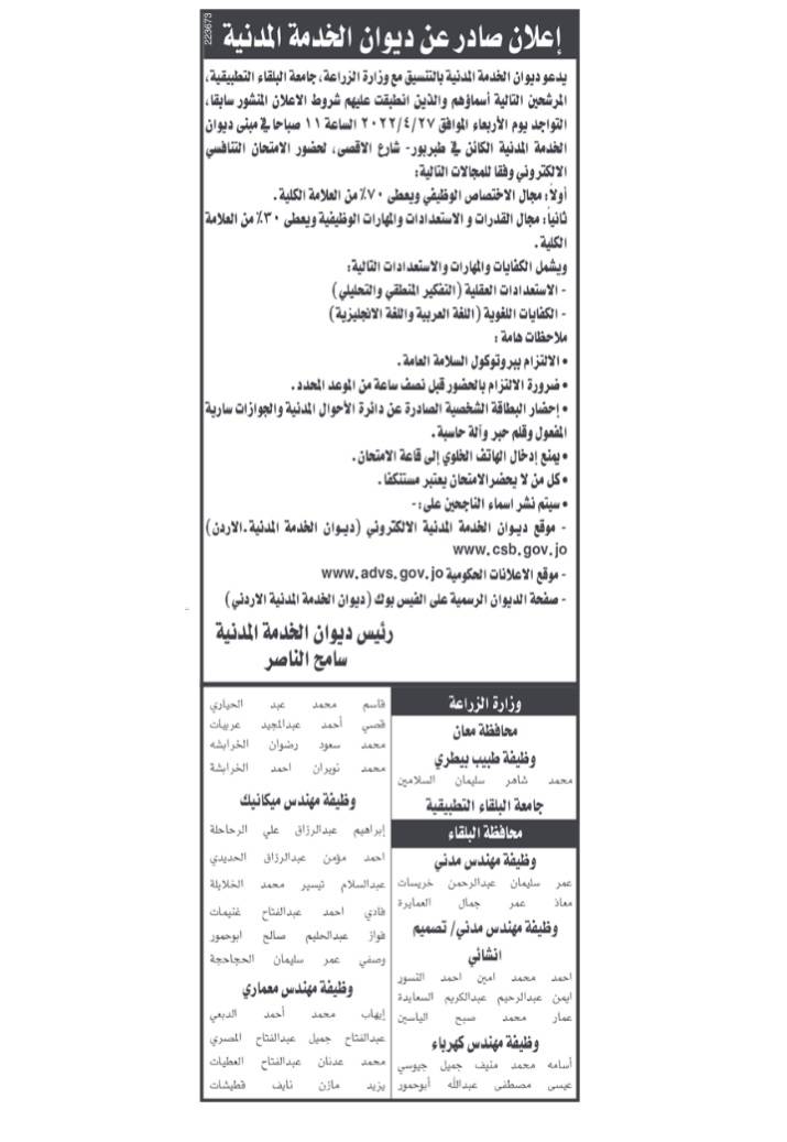 دعا ديوان الخدمة المدنية بالتنسيق مع وزارة الزراعة وجامعة البلقاء التطبيقية، مرشحين لحضور الامتحان التنافسي الإلكتروني.