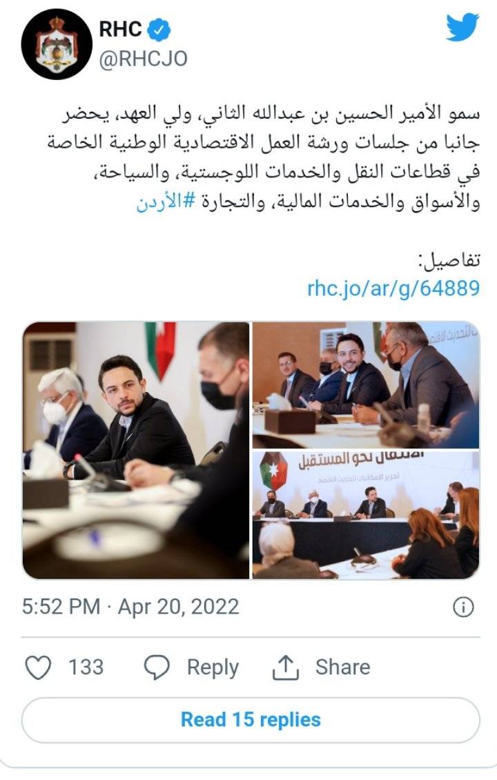 نيروز الإخبارية : حضر سمو الأمير الحسين بن عبدالله الثاني، ولي العهد، اليوم الأربعاء، جانباً من جلسات ورشة العمل الاقتصادية الوطنية المنعقدة في الديوان الملكي الهاشمي تحت عنوان "الانتقال نحو المستقبل: تحرير الإمكانيات لتحديث الاقتصاد".