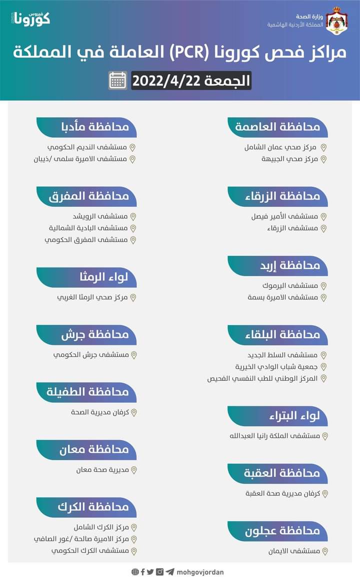 أعلنت وزارة الصحة عن مراكز فحص كورونا (PCR) العاملة يوم الجمعة 2022/4/22 في المملكة حسب التالي: