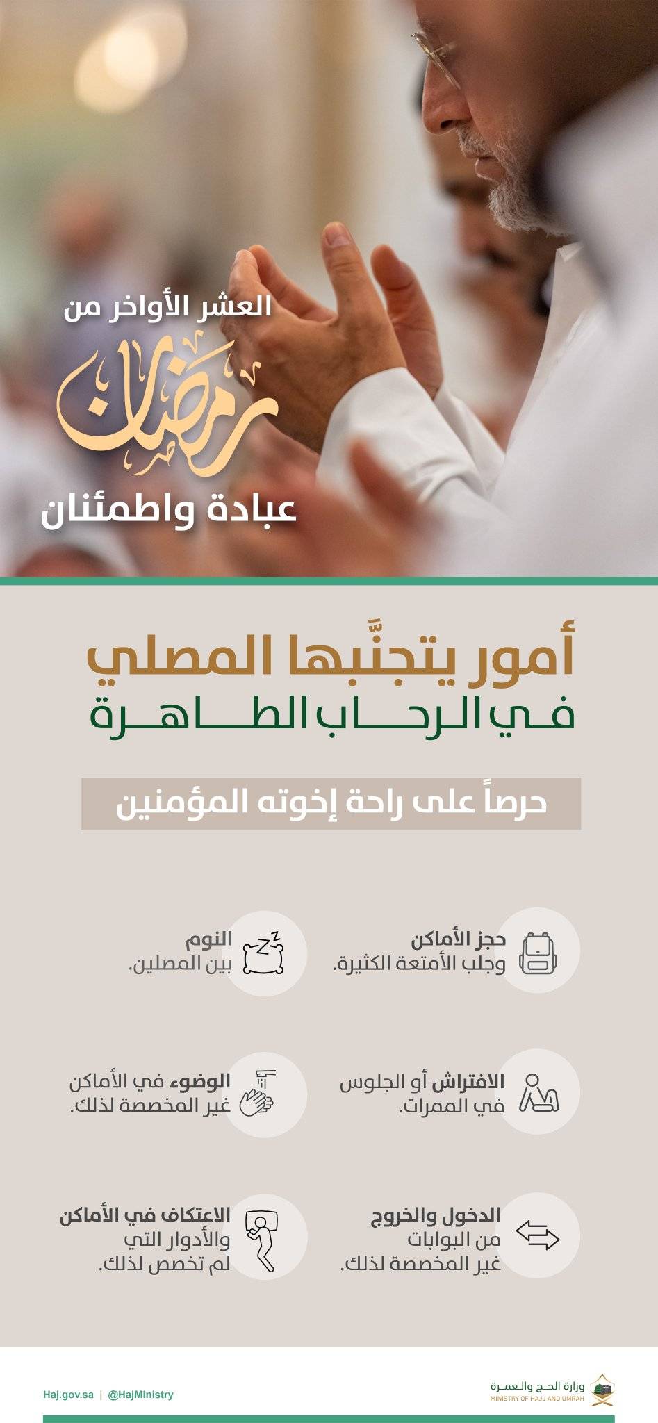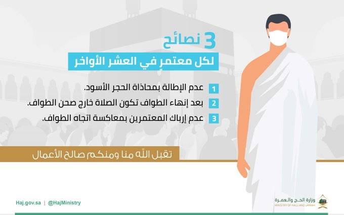 وقالت الوزارة عبر تويتر ، أن من النصائح للمعتمرين خلال العشر الاواخر : عدم الاطالة بمحاذاة الحجر الأسود ، وانه بعد انهاء الطواف تكون الصلاة خارج صحن الطواف ، وعدم ارباك المعتمرين بمعاكسة اتجاه الطواف .