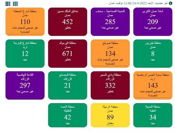 وبين المؤشر أن منطقة أمانة عمان الكبرى، والمدينة الصناعية في سحاب، والقاعة الهاشمية في الزرقاء جودة الهواء بها غير صحي جدا.