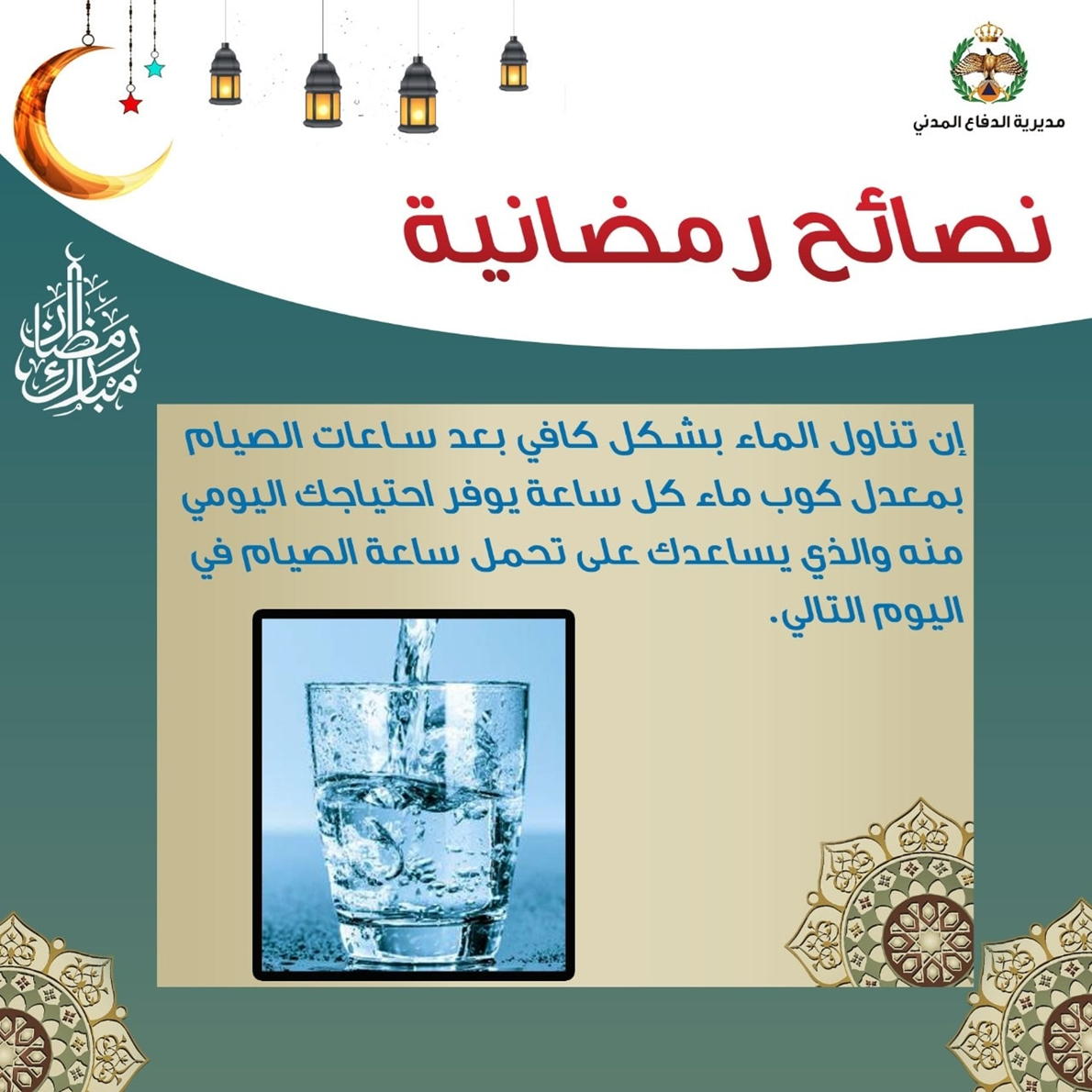 وقالت المديرية في إدراج لها على "فيسبوك"، إن تناول الماء بشكل كافي بعد ساعات الصيام بمعدل كوب ماء كل ساعة يوفر احتياجات الجسم اليومية من الماء.