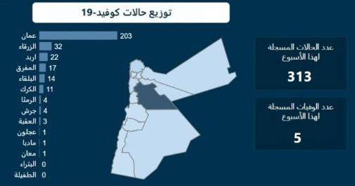 في المقابل لم يتجاوز عدد الإصابات في اي محافظة حاجز 32 إصابة ، الا في العاصمة عمان التي سجلت 203 إصابات.