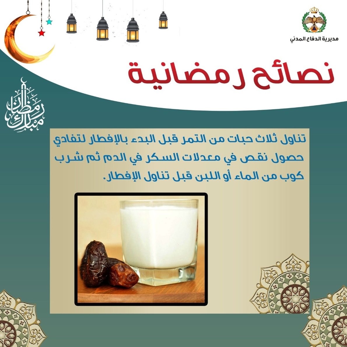ودعت المديرية في إدراج لها على "فيسبوك"، إلى تناول ثلاث حبات من التمر قبل البدء بالإفطار لتفادي حصول نقص في معدلات السكر في الدم ثم شرب كوب من الماء أو اللبن قبل تناول الإفطار.