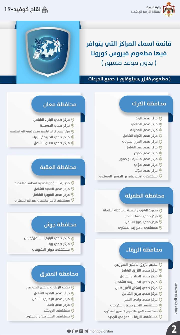 أعلنت وزارة الاردنية عن قائمة اسماء المراكز التي يتوافر فيها مطعوم فيروس كورونا (بدون موعد مسبق) #جميع_الجرعات ليوم الثلاثاء: