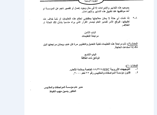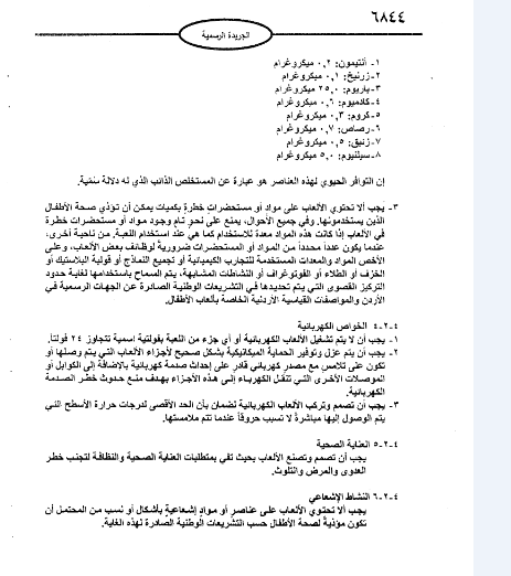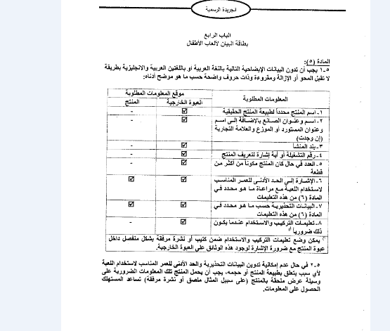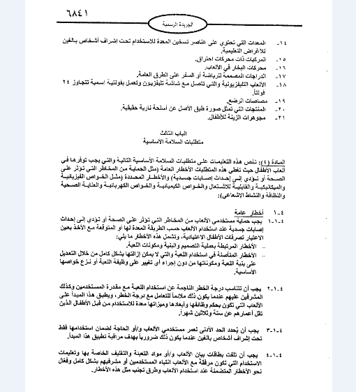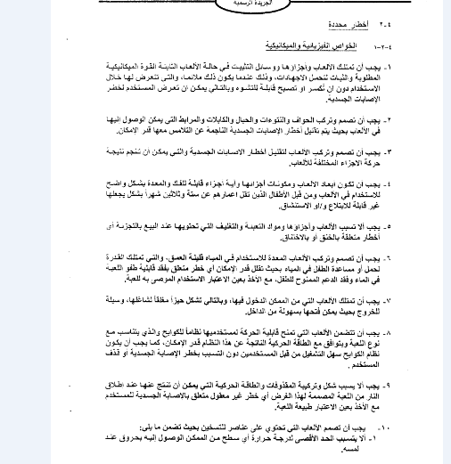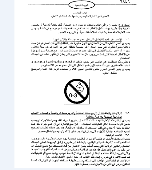 وتوضح التعليمات أنه يجب أن لا تكون اللعبة قابلة للتفجير أو تحوي على عناصر قابلة للانفجار عند استخدامها، كما يجب أن تصمم وتركّب الألعاب بحيث لا تشكل مخاطر صحية أو أخطار متعلقة باصابات جسدية من خلال تناولها بالفم أو الاستنشاق أو التلامس مع الجلد أو العينين.