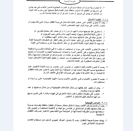 وبحسب تعليمات سلامة الألعاب، فإنه يجب أن لا تحتوي ألعاب الأطفال على عناصر قابلة للاشتعال في بيئة الطفل، بحيث يجب أن لا تحتوي على مستحضرات خطرة إلا في حالات الضرورة لوظيفة اللعبة بشكل صحيح.