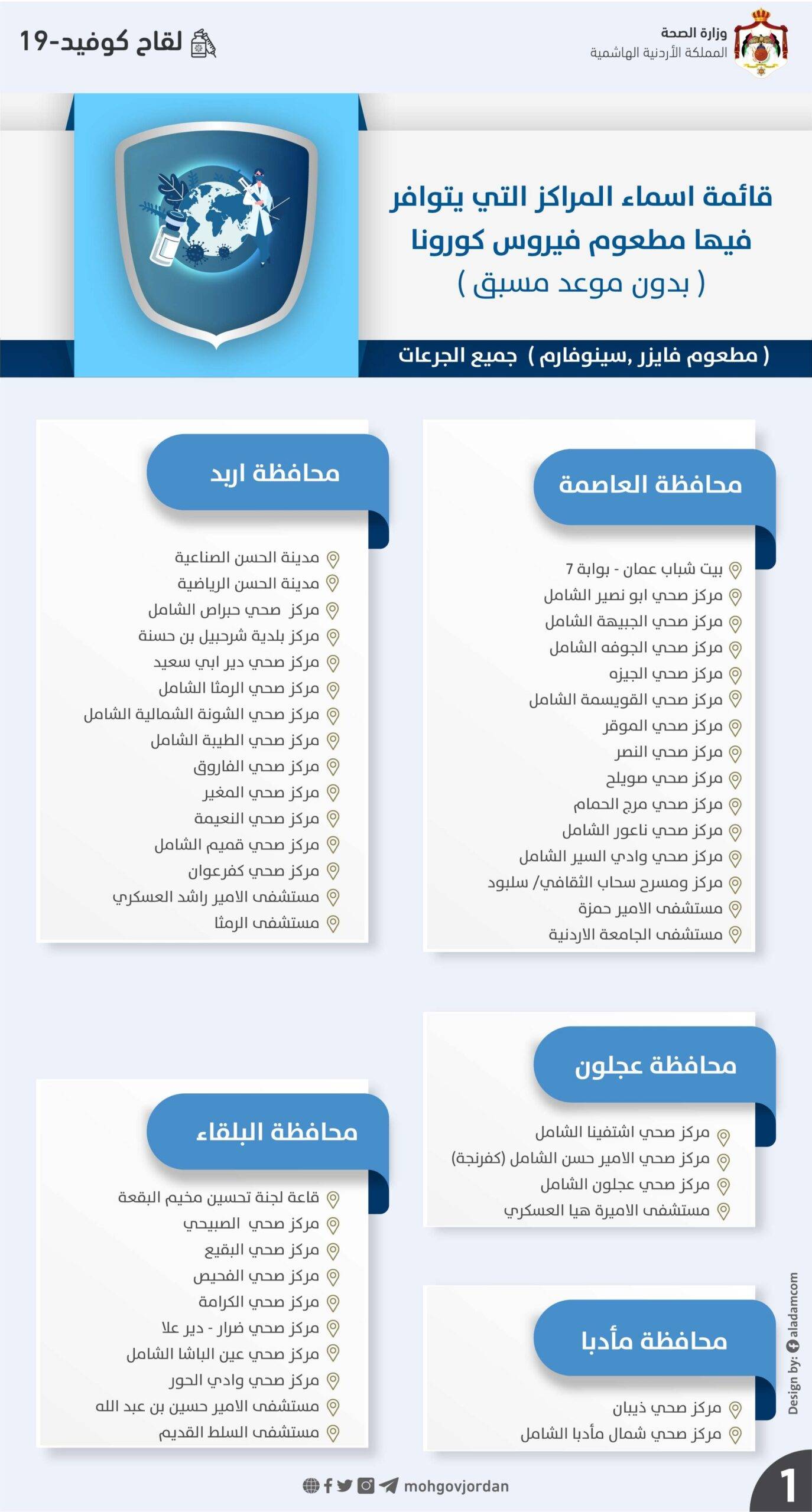 ويكون دوام مراكز المطاعيم من الساعة 9:00 صباحاً – 2:00 مساءً.