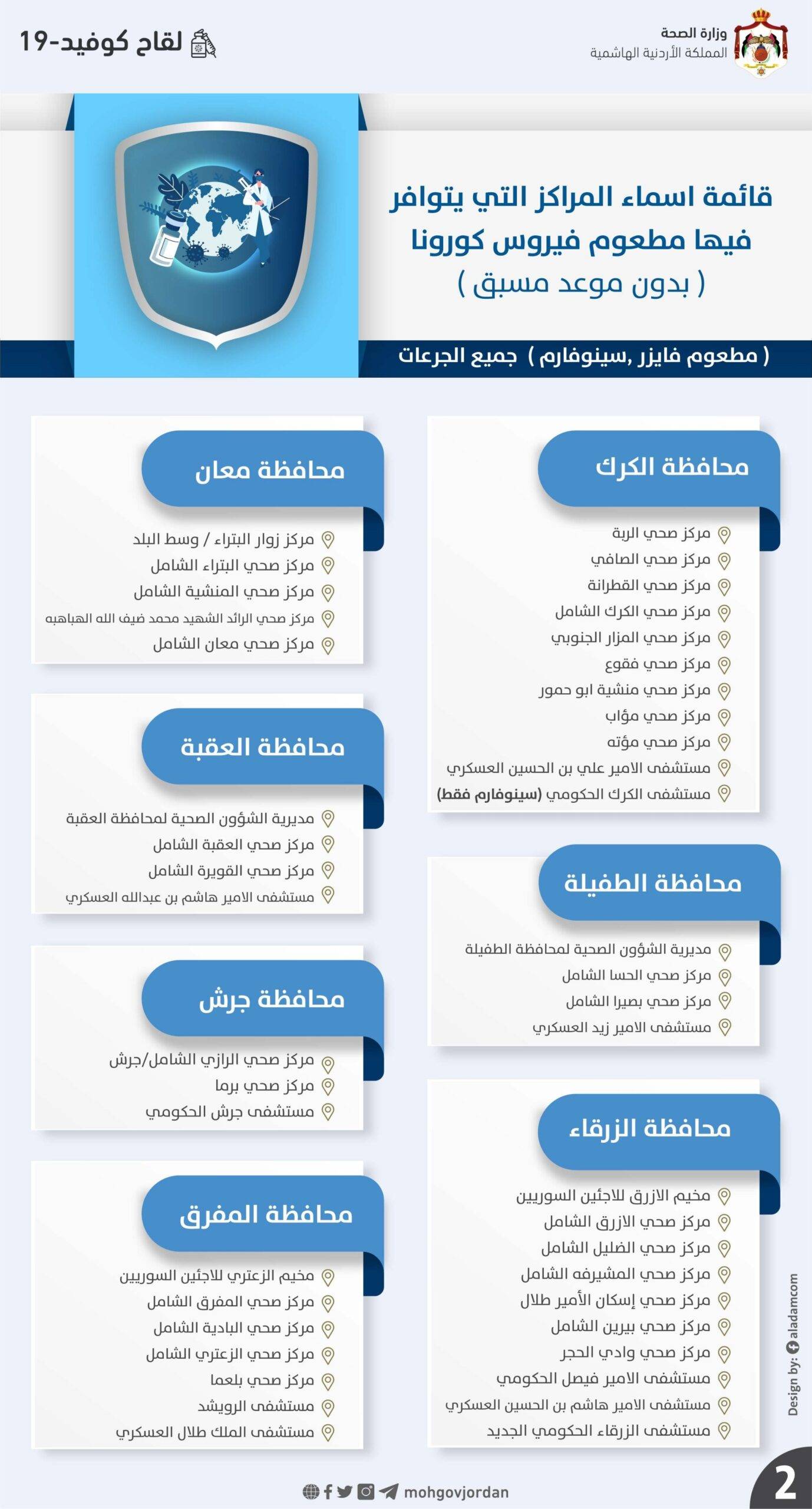 أعلنت وزارة الصحة قائمة أسماء المراكز التي يتوافر فيها مطعوم فيروس كورونا (بدون موعد مسبق) جميع الجرعات ليوم الأربعاء.