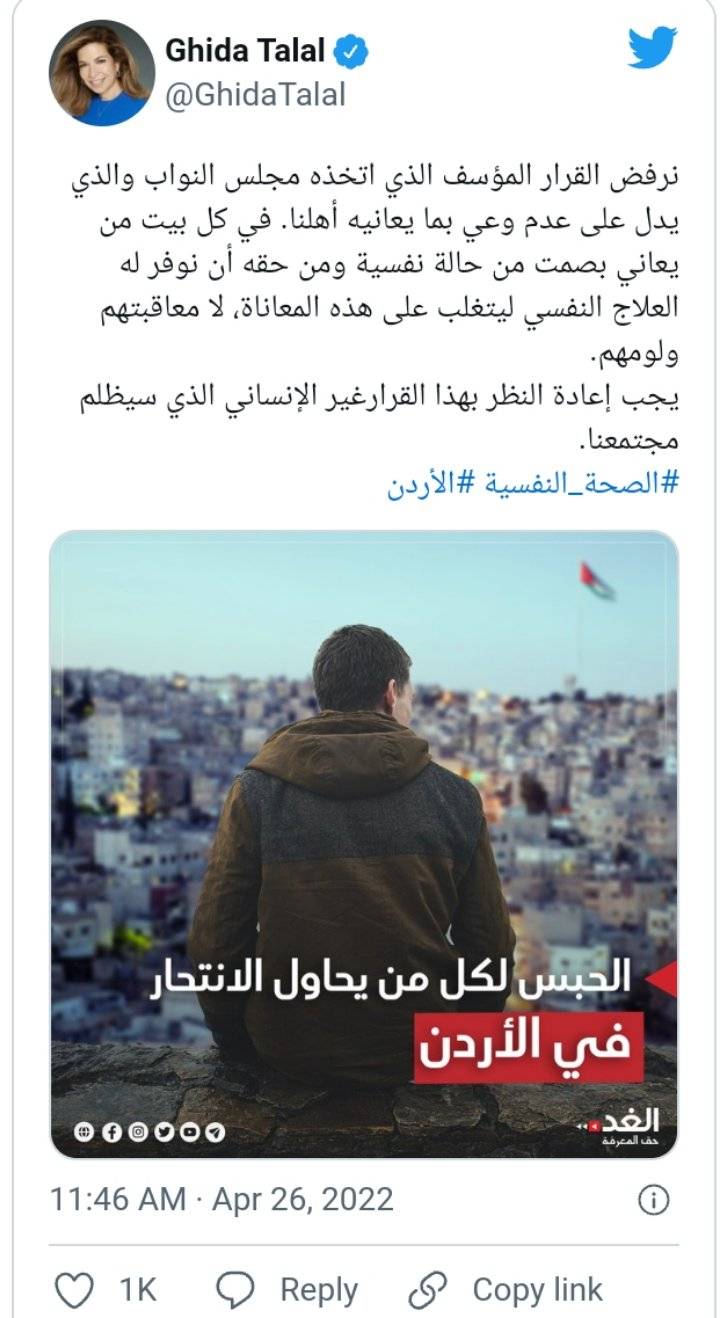 انتقدت الأميرة غيداء طلال، قرار مجلس النواب بحبس وتغريم كل من يحاول الانتحار في الأماكن العامة.