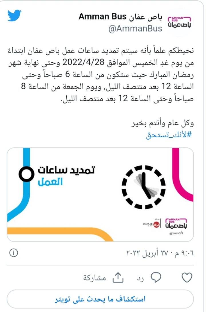 قالت رؤية عمّان للنقل، المشغلة لحافلات باص عمّان والباص سريع التردد، إنه "سيتم تمديد ساعات عمل باص عمّان ابتداءً من الخميس وحتى نهاية شهر رمضان المبارك، حيث ستكون من الساعة 6 صباحا وحتى الساعة 12 بعد منتصف الليل".