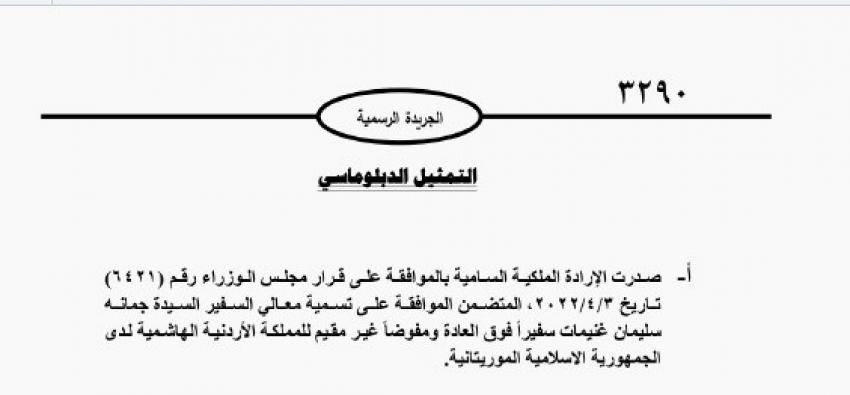 : صدرت الإرادة الملكية السامية بالموافقة على قرار مجلس الوزراء المتضمن الموافقة على تسمية السفيرة جمانة غنيمات سفيرا فوق العادة ومفوضا غير مقيم للمملكة الأردنية الهاشمية لدى الجمهورية الاسلامية الموريتانية.