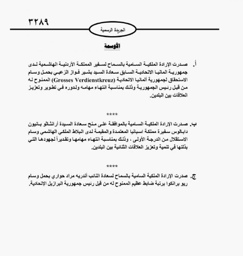 نيروز الإخبارية : صدرت الإرادة الملكية السامية بالسماح للسفير الأردني في ألمانيا السابق بشير فواز الزعبي بحمل وسام الاستحقاق لجمهورية ألمانيا الاتحادية الممنوح له من قبل رئيس الجمهورية وذلك بمناسبة انتهاء مهامه ولدوره في تطوير العلاقات بين البلدين.
