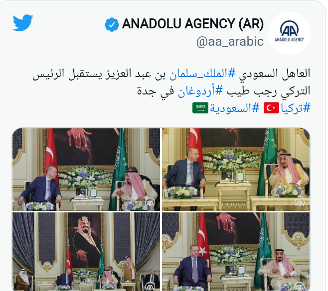 ونشرت وكالة الأناضول الرسمية التركية صورا من استقبال العاهل السعودي للرئيس التركي في مدينة جدة السعودية.