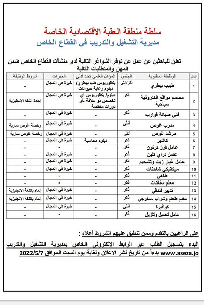 اعلنت سلطة منطقة العقبة الاقتصادية الخاصة /مديرية التشغيل والتدريب في القطاع الخاص عن توفر الشواغر المرفقة تحت محتوى الخبر وذلك لدى منشأت القطاع الخاص .