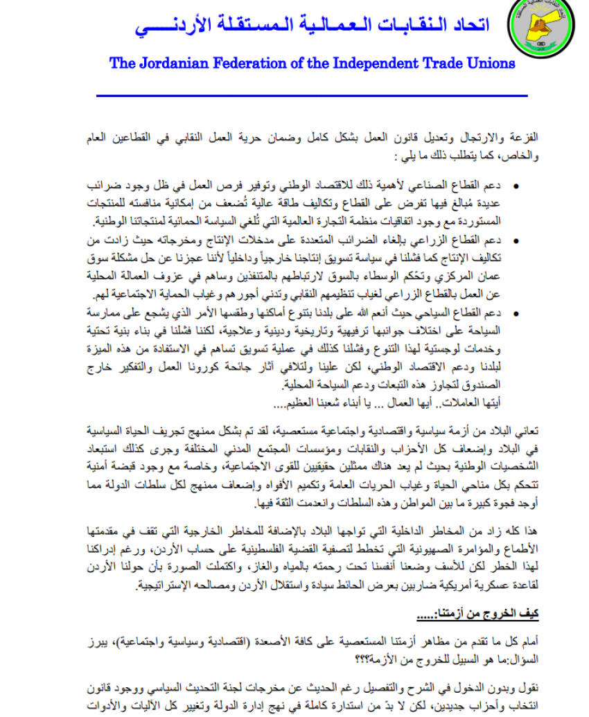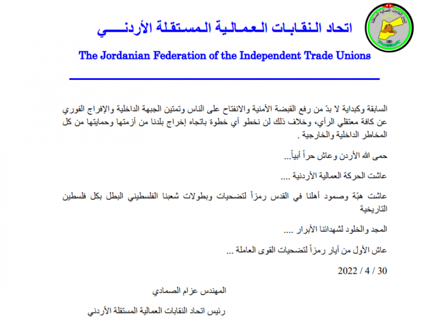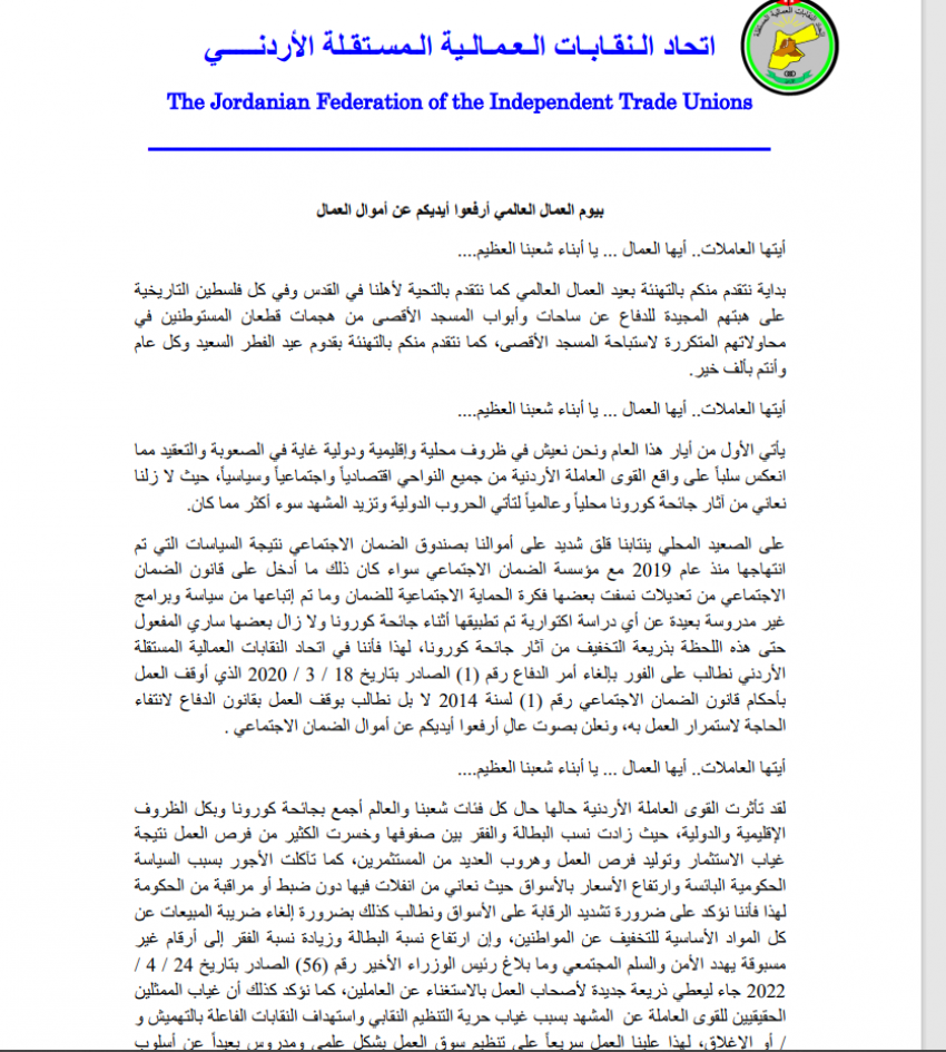 نيروز الإخبارية : أصدر اتحاد النقابات العمالية المستقلة الأردني اليوم السبت بيانا خاصا، بمناسبة قرب حلول عيد العمال الذي يصادف يوم غد الأحد الأول من أيار 2022 .