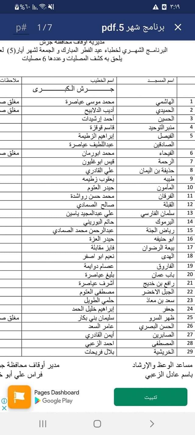 طعلما بأنه ستقام صلاة عيد الفطر المبارك في محافظة جرش تمام الساعه 6:45صباحا، في كافة المساجد التي تقام فيها صلاة الجمعة، بالإضافة إلى المصليات التالية،: