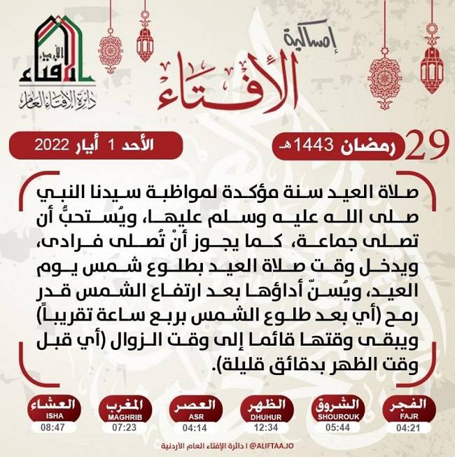 وبينت الافتاء في إمساكيتها لليوم الـ 29 من شهر رمضان المبارك أن صلاة العيد سنة مؤكدة لمواظبة سيدنا محمد صلى الله عليه وسلم عليها، كما يستحب أن تصلى صلاة العيد جماعة، ويجوز أن تصلى فرادى”.