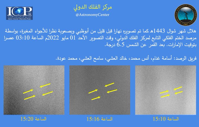 : نشر مركز الفلك الدولي، هلال شهر شوال 1443ه بعد أن تم تصويره نهار اليوم الاحد، من أبوظبي وبصعوبة نظرا للأجواء المغبرة.