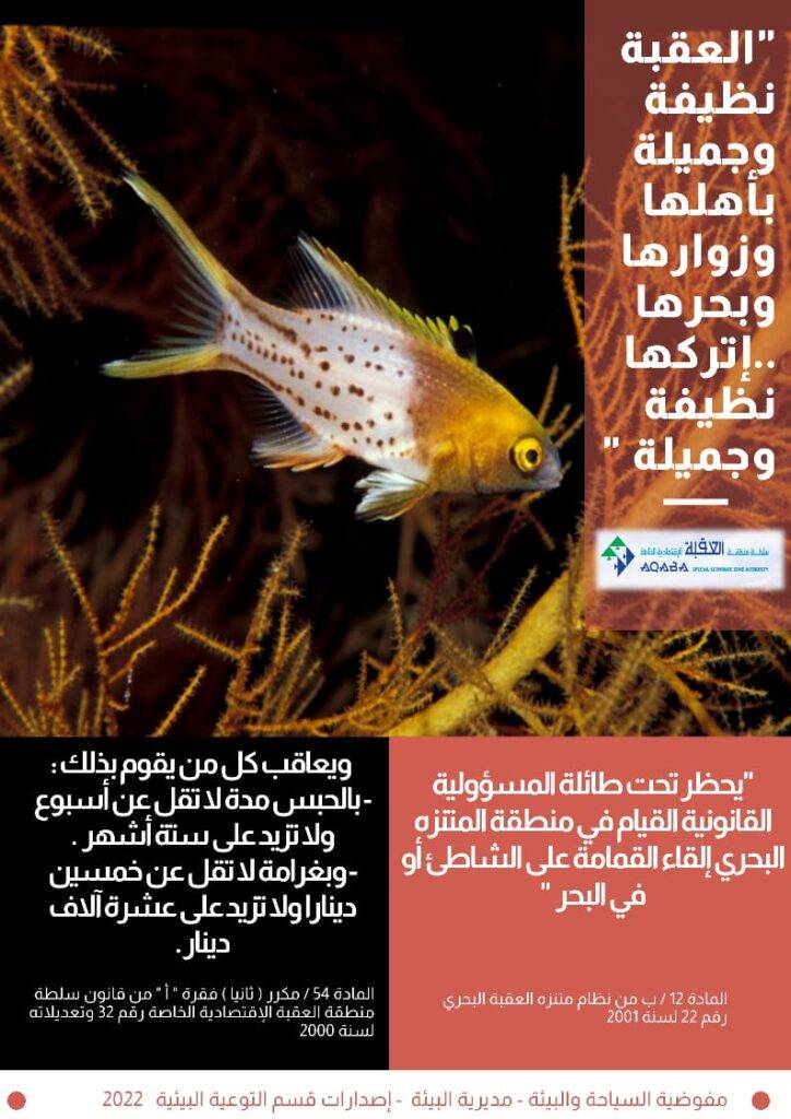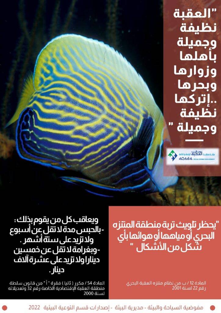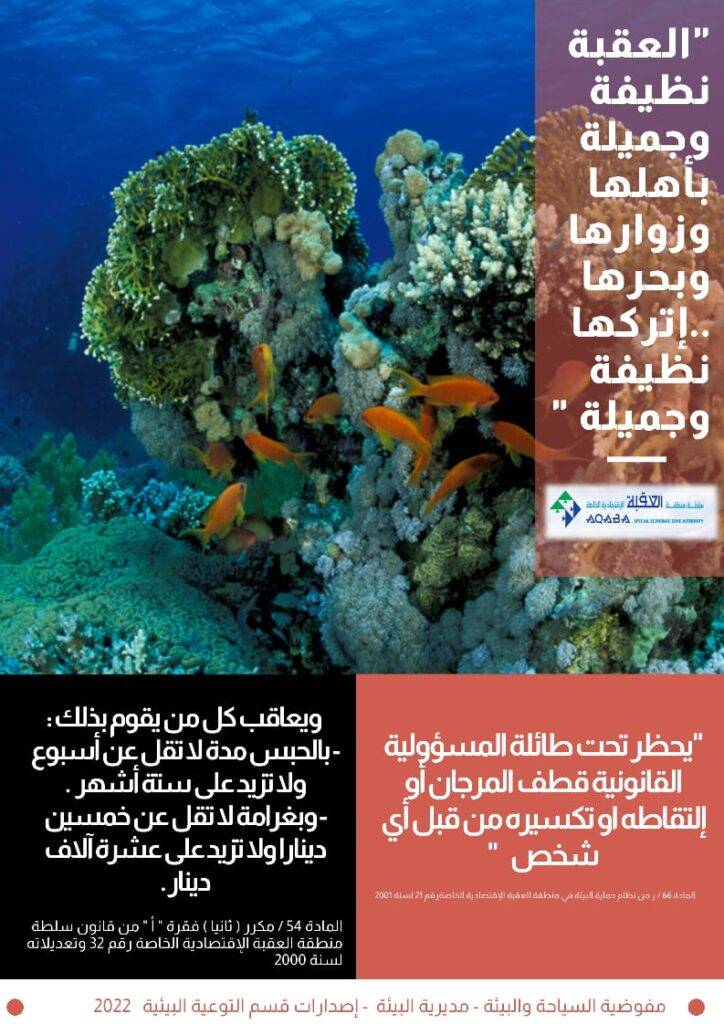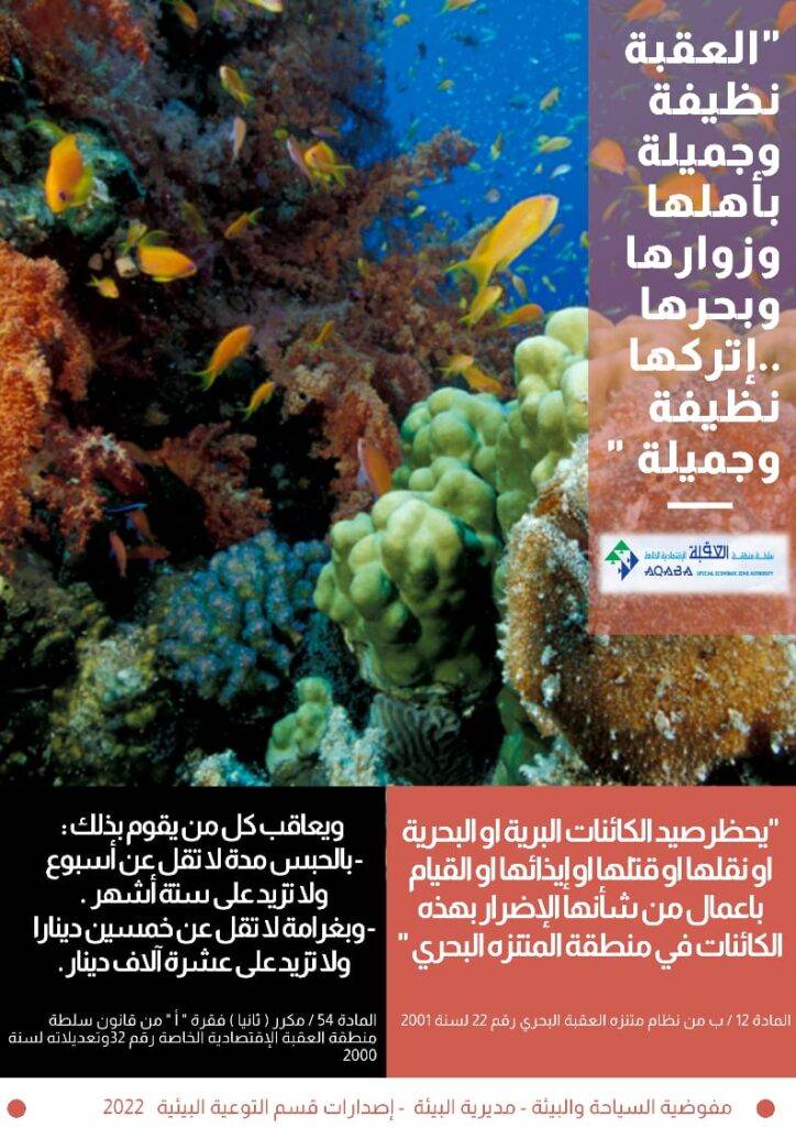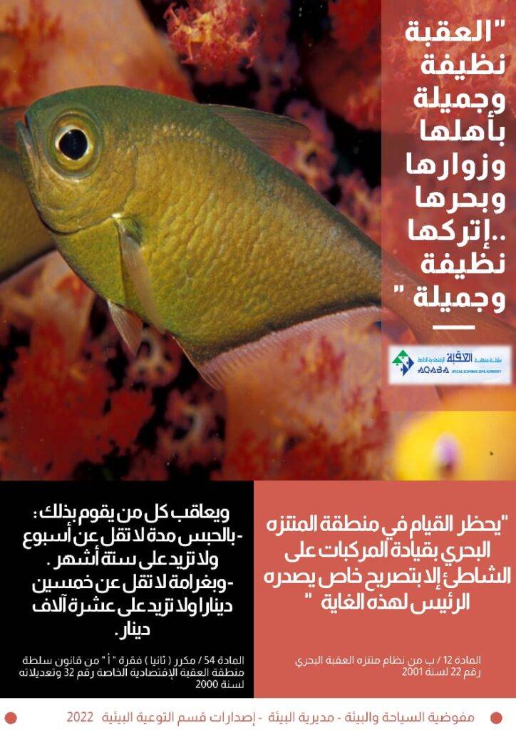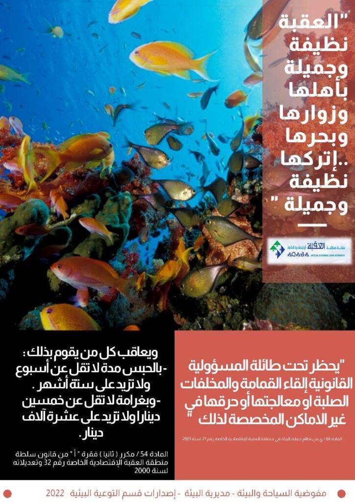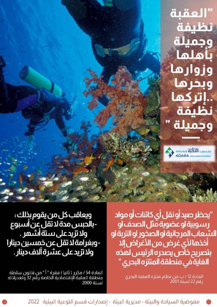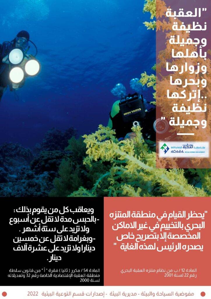 "راجين من الجميع التعاون في الإلتزام بالتعليمات الخاصة بحماية البيئة البحرية في خليج العقبة لتبقى لنا وللاجيال القادمة …نتمنى لكم رحلة آمنة وسعيدة ”