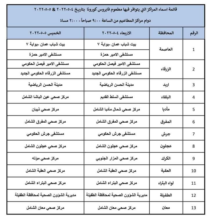 أعلنت وزارة الصحة عن قائمة اسماء المراكز التي يتوافر فيها مطعوم فيروس كورونا (بدون موعد مسبق) #جميع_الجرعات ليومي الاربعاء والخميس 2022/5/4 - 2022/5/5 :