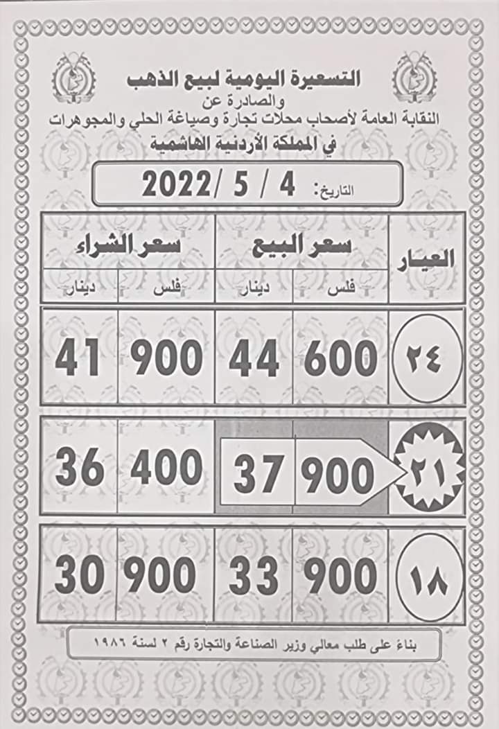 ويشمل التقريــر أسعار المعدن عيارات ( 24، 21، 18) ، كونها الأكثر تداولا في الأردن.